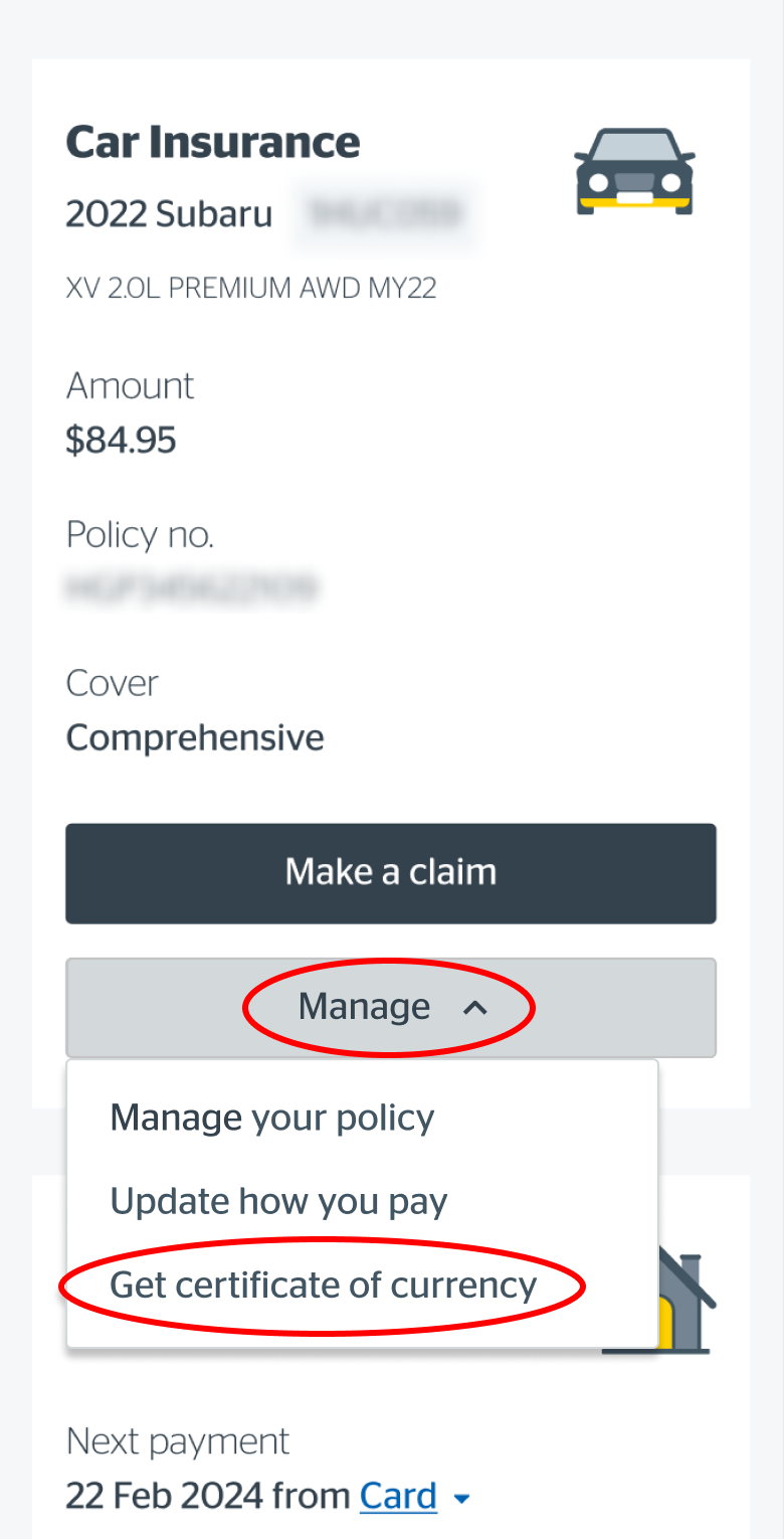 Scroll down to your policy and click on Manage, from the drop down list select Get certificate of currency.